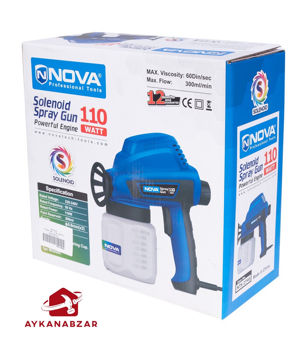 پیستوله برقی نووا مدل 2740 دارای موتور قدرتمند 110 واتی است. این مدل با سیستم رنگ پاشی سلونوئید مجهز شده است. دارای سیستم پاشش پیشرفته جهت یکنواختی پاشش است.