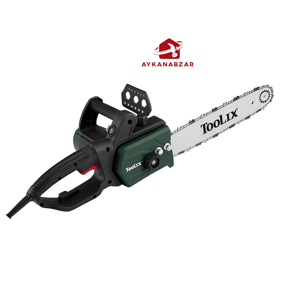 اره برقی زنجیری تولیکس دارای بدنه ای به رنگ سبز و مشکی است.